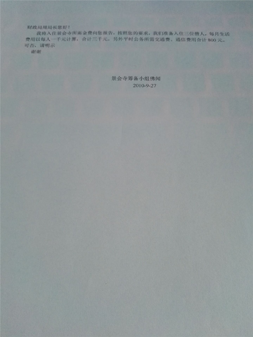 2.佛闻法师带领僧团于2010年9月27日正式入住景会寺,因为景会寺化缘筹建账户由财政局代管,所以向财政局周局长报告,我们三位法师入住,现在要解决临时生活费用,每位法师每月一千元计报,外加平时公务所需交通加油费、通信费合计每月八百元。后来领导研究决定,整个念佛堂每月3000元(包括所有法师的生活费),化缘的钱要交到景会寺筹建账户,也就是每月我们化缘交到我们的筹建专户,然后每月再去支出三千元做为我们整个佛堂的生活费、法师单费、包括水费、垃圾清理费等。每月三千元一直至2014年3月25日会议更改。