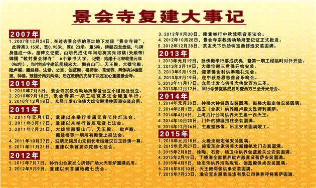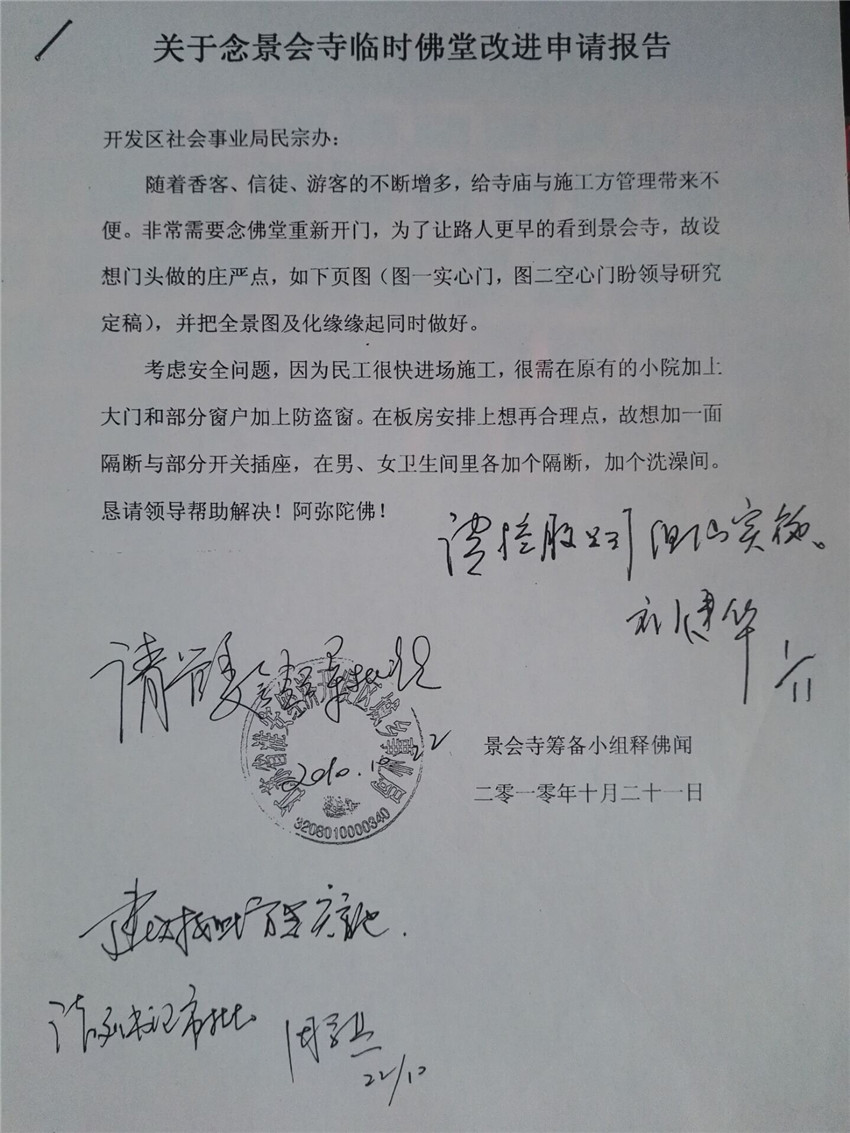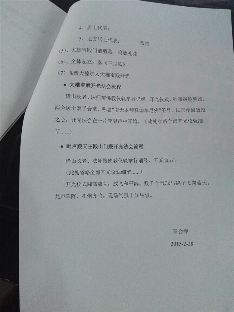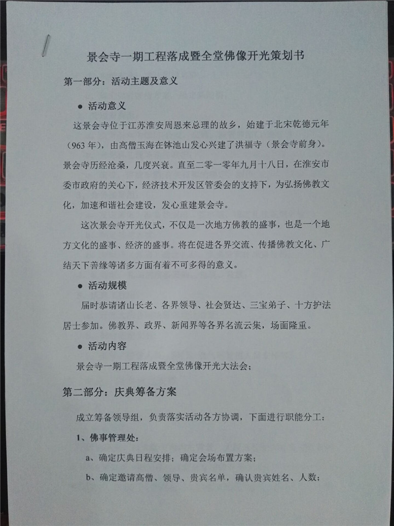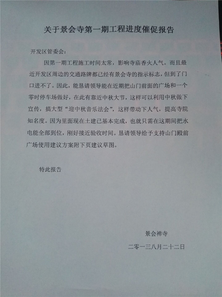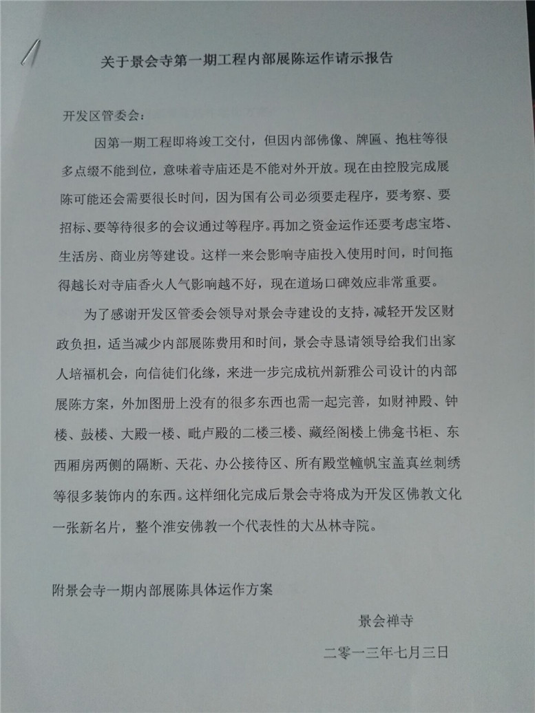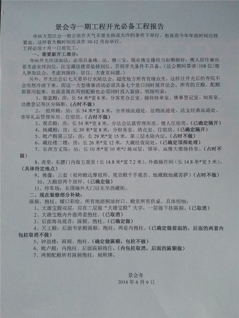 12.原本根据开发周区书记慈悲设想,打算在2014年景会寺一期工程必须举行落成开光庆典,但因为多方面条件不具备,特此向管委会报告催促建议,特别是考虑大型法会的安全与接待,并细化具体安排搭建临时斋堂、僧人寮房、办公客堂、高僧大德接待室等配套用房。