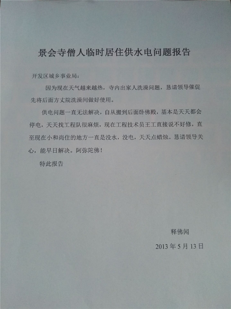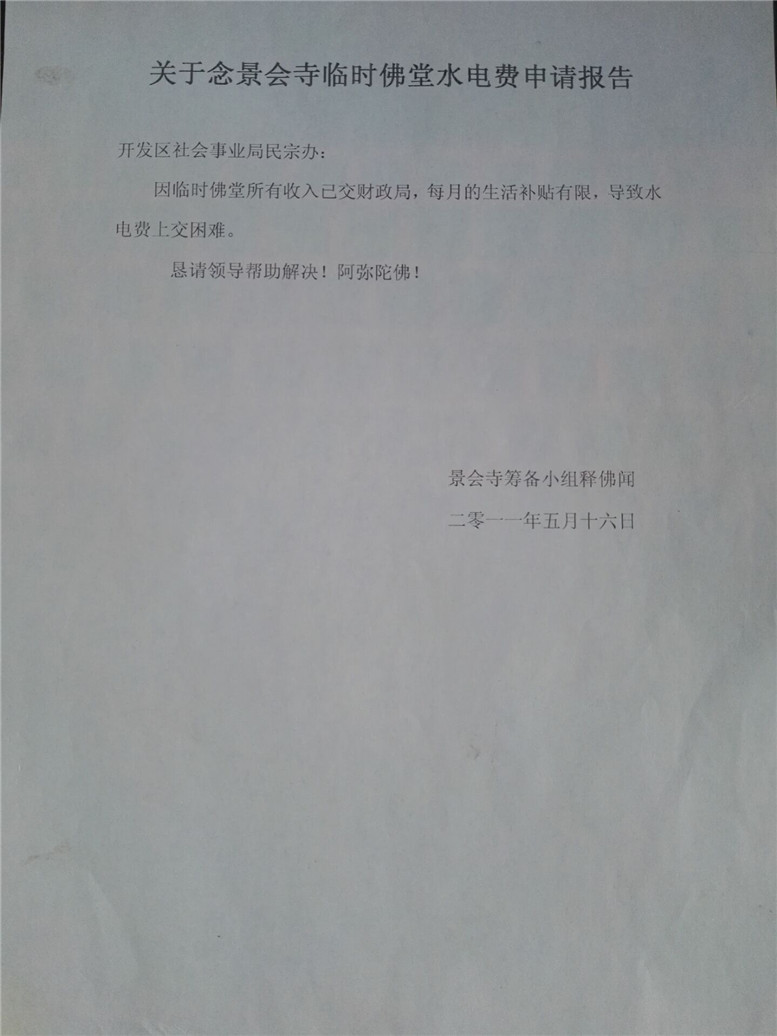 4.因为佛堂所有收入交财政局景会寺专用账户,所以后来水电费交付困难,2011年5月16日申请报告。但后来水问题还是自付没有解决。