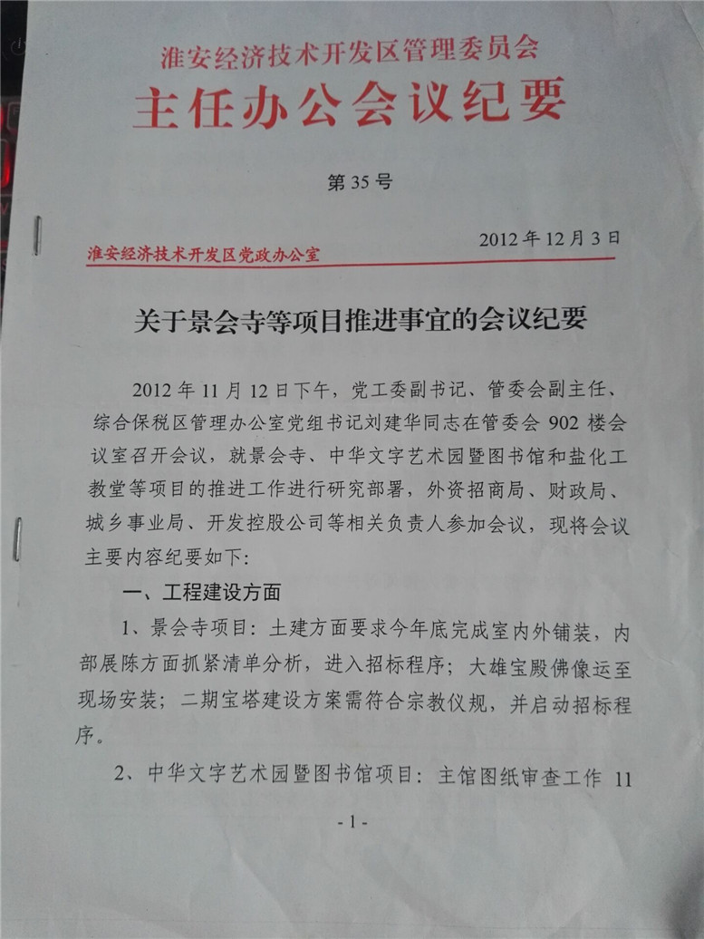 6.2012年11月24日刘书记九楼会议室召开工程进度会议,要求卧佛殿先落成启用,原开发控股副总童磊会议提出场所管理到底是谁方,现在景会寺的正式账户已经使用,是不是转移到开发控股管理,后来经讨论国资委、宗教管理办、景会寺都没有同意,也就一直至今放在国资委监管景会寺账户。