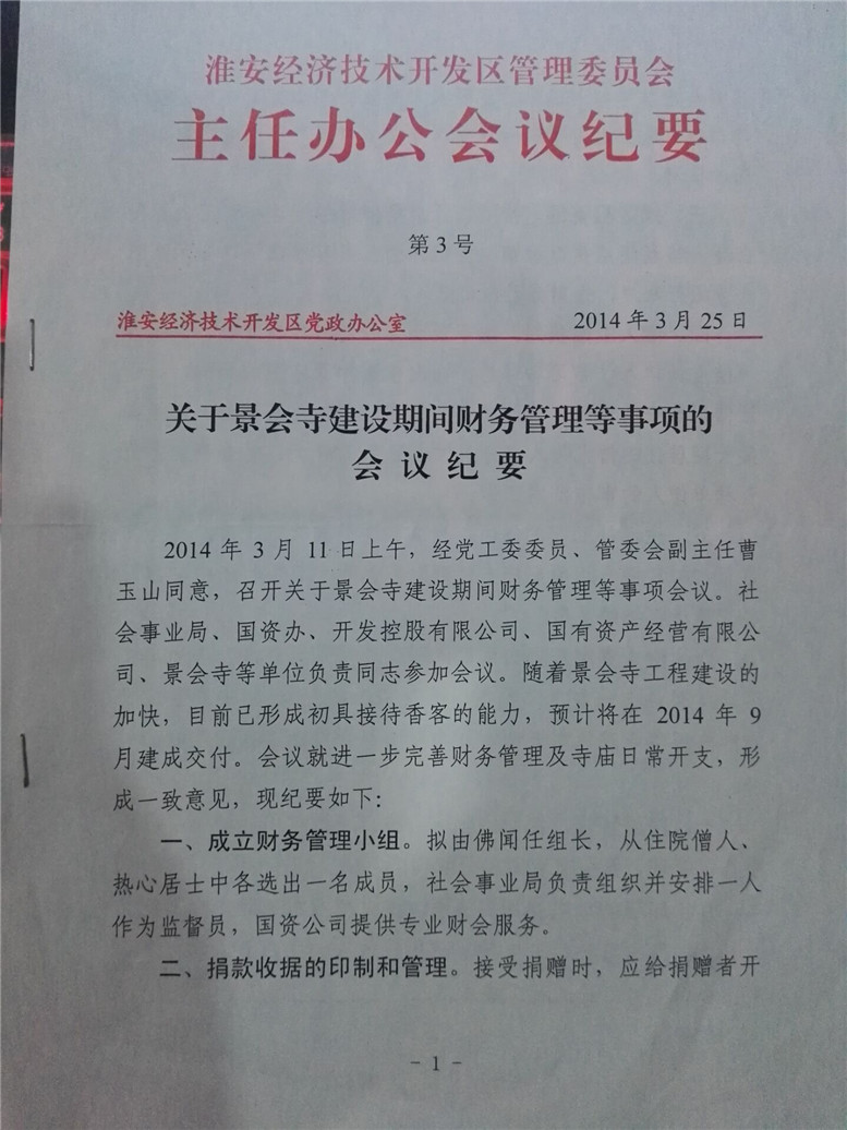 8.刘建华书记很慈悲对工作一丝不苟,退休后,由曹玉山主任接管,2014年3月11日将景会寺建设期间财务管理召开会议,寺院收入交景会寺专有账户,每月再从景会寺账户支出原来的三千元不变,外加四名常住法师每月每人八百元生活单费。