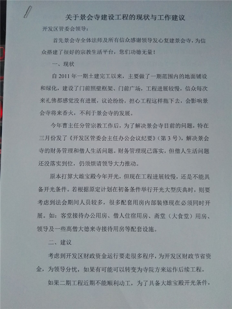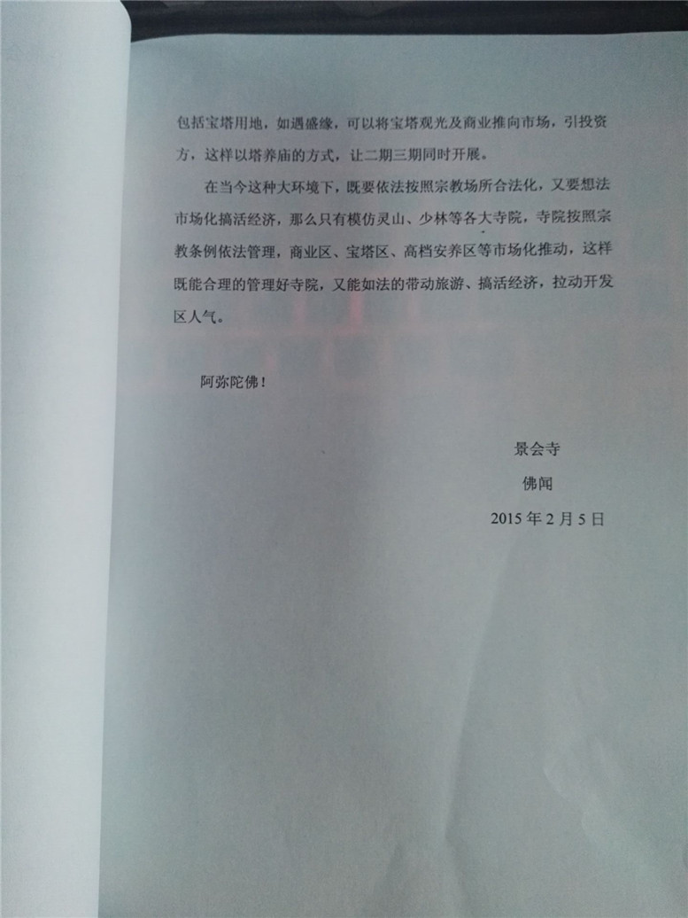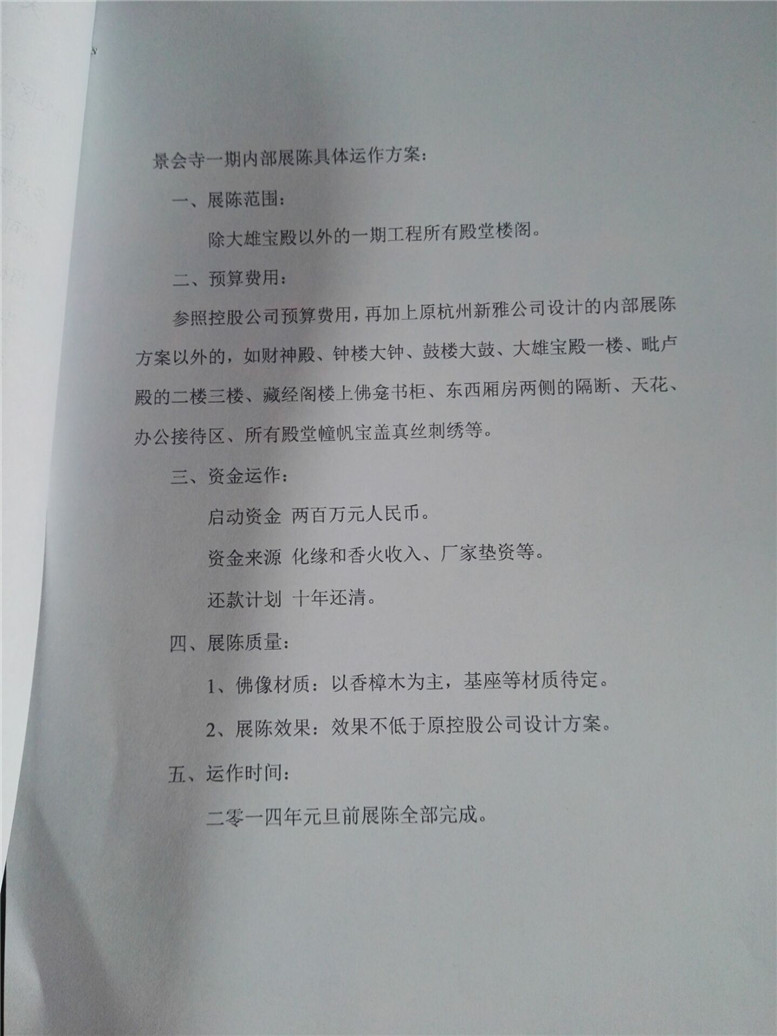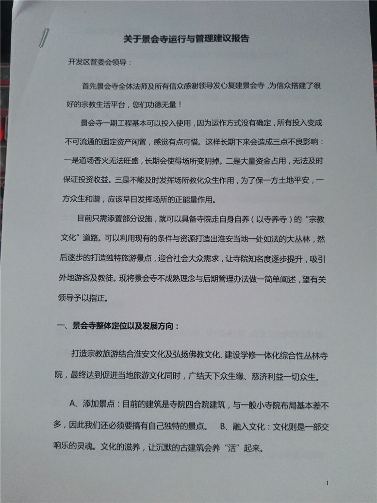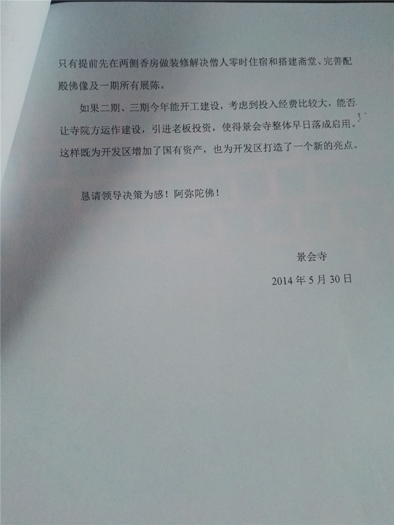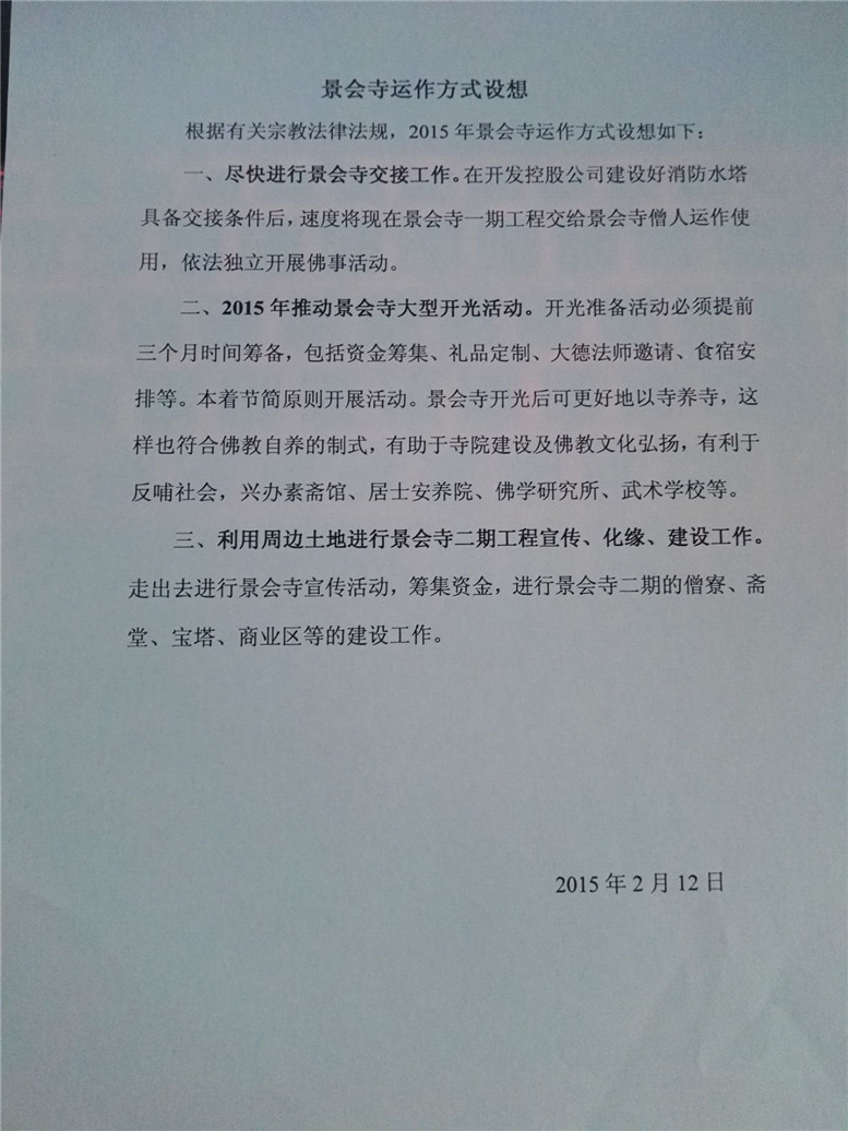 14.在2014年中下旬,到2015年初,开发区坚持安排景会寺移交僧团运作,并要求法师拟一份“关于景会寺移交僧团运作与未来发展方向”。