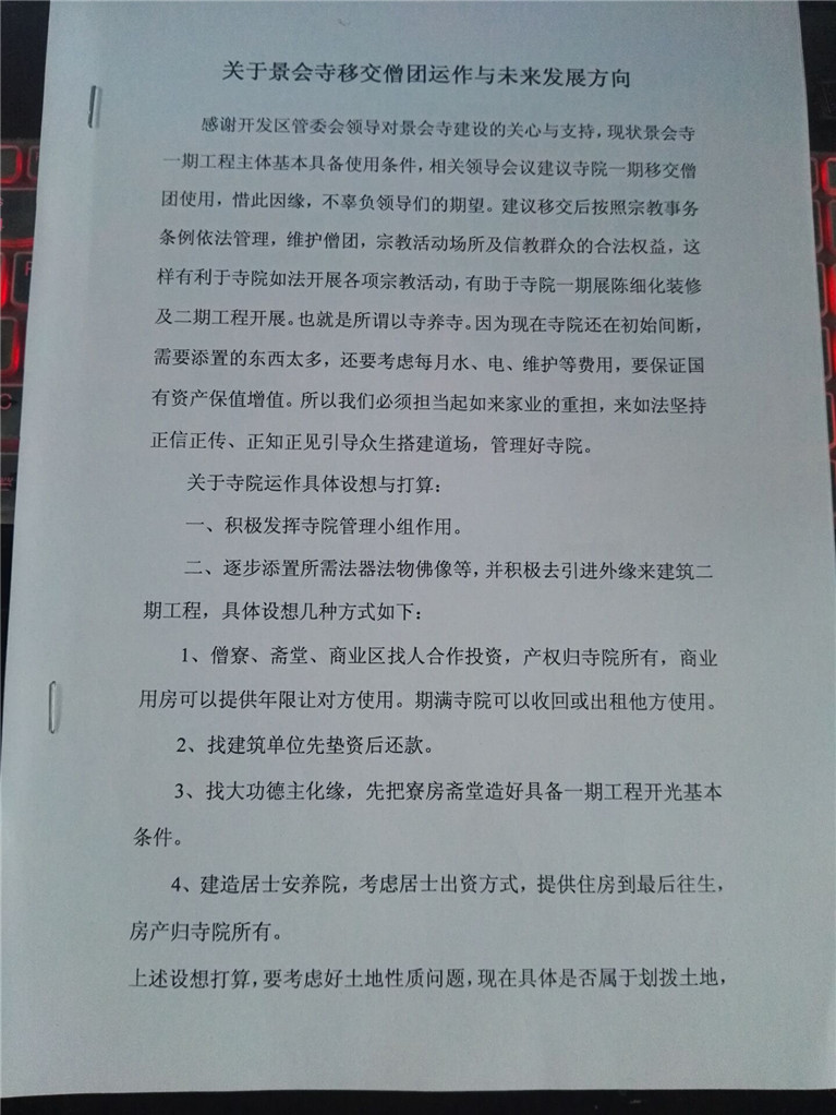 法师拟一份“关于景会寺移交僧团运作与未来发展方向”