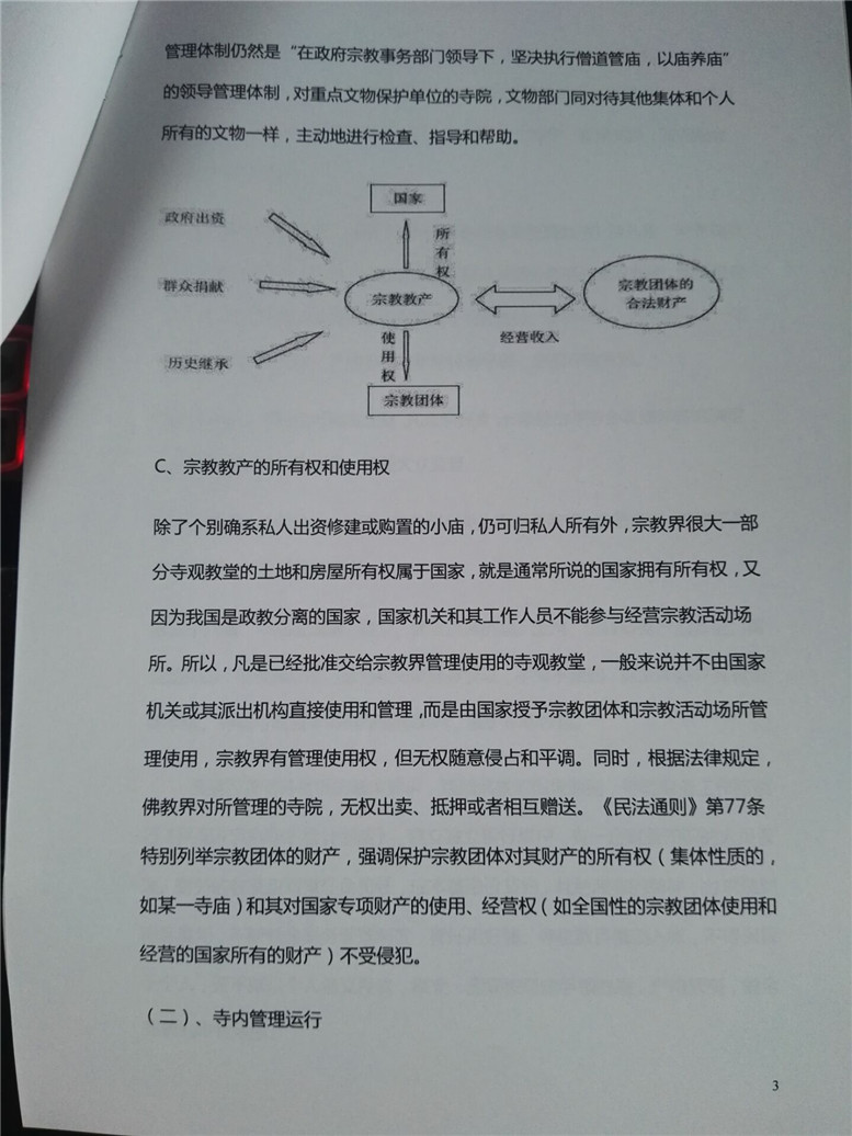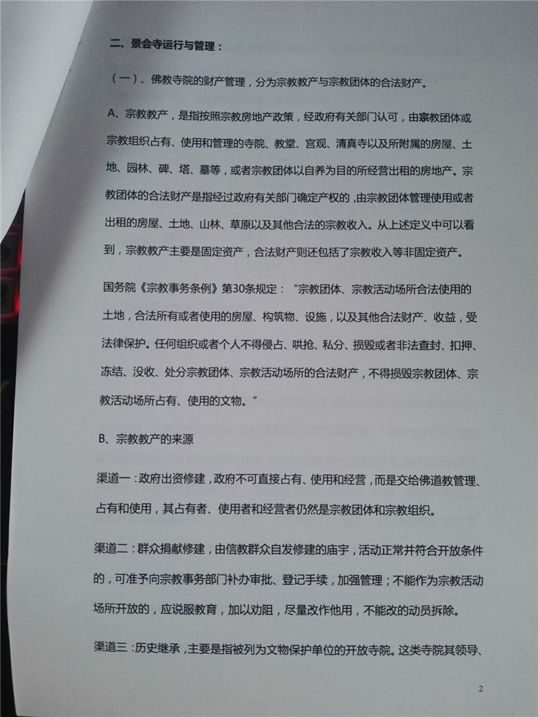 15.到了2015年上半年,骆观副局长再次让寺院拟一份“关于景会寺运作与管理报告”,说上次报告不够具体,能不能在上面反应譬如你们僧团运行,可不可以说一年还是能交管委会多少钱,法师说不可以,只能按照宗教政策正常运作,可以积极兴办佛教文化和教育事业,在国家政策允许范围内,在量力自愿的原则下,支持社会公益事业,如举办安老、施诊、修桥补路、办学等利生事业,对社会做出应有的贡献。法师也多次与领导强调宗教资产移交僧团使用,所有权为国家,经营收入等做了一图详细说明报告管委会领导。