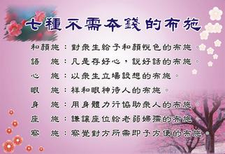 佛:一个人即使一无所有也可以给予别人七种东西:颜施:微笑处事;言施:多说鼓励赞美安慰的话;心施:敞开心扉对人和蔼;眼施:善义的眼光给予别人;身施:以行动帮助别人;座施:谦让座位;房施:有容人之心。