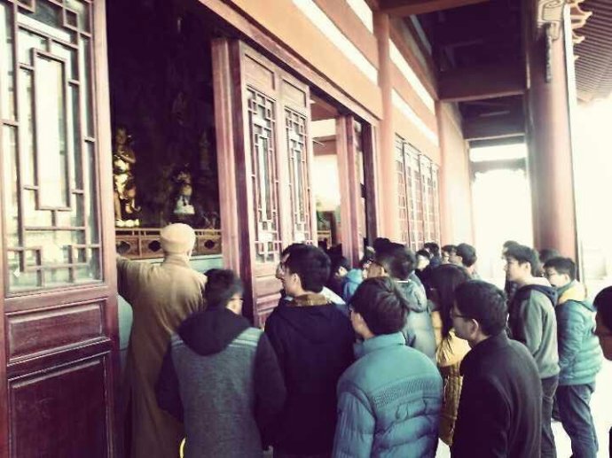 上午,南京林业大学南方学院土木工程系一百多名师生来景会寺参观学习,观看了寺院的整体建筑风格,以及寺内各殿堂展陈,并与法师在山门殿前合影。