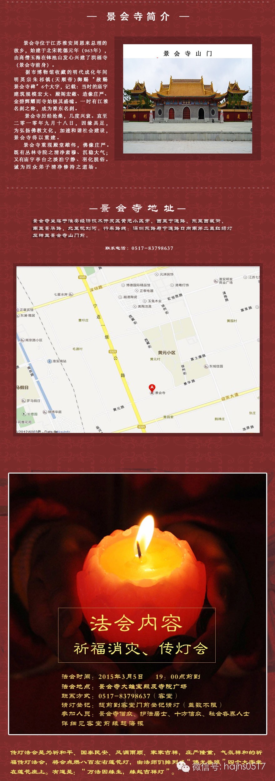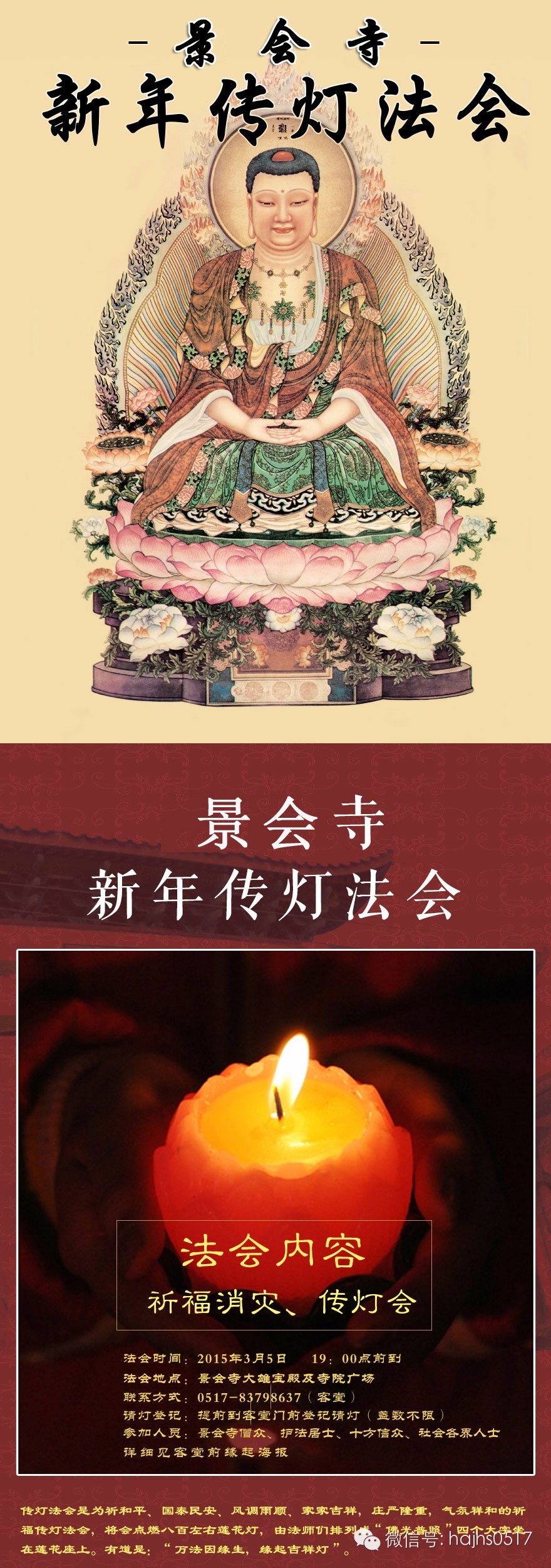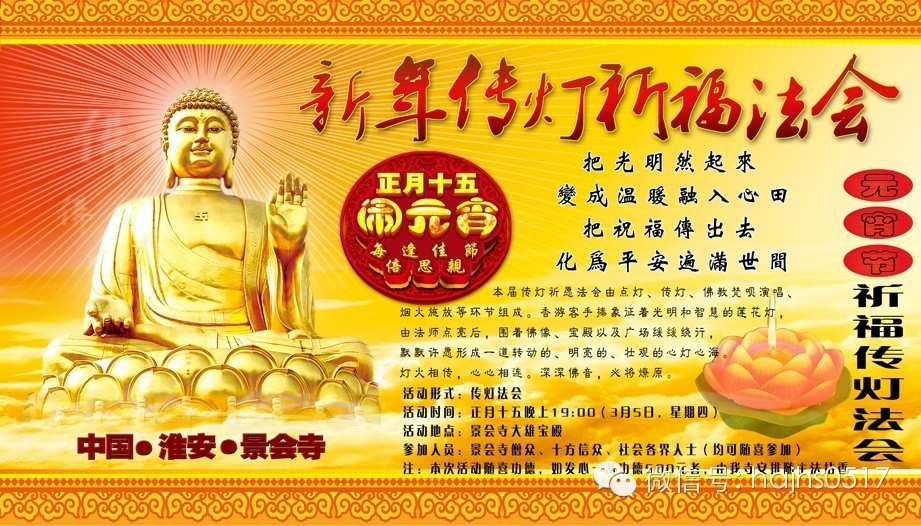 淮安景会寺正月十五传灯祈福法会在大雄宝殿举行,法会由点灯、传灯、佛教梵呗演唱、烟火施放等环节组成。香游客手捧象征着光明和智慧的莲花灯,由主法佛闻法师从佛前供灯处点燃明灯传向大众,围着佛像、宝殿以及广场缓缓绕行,默默许愿形成一道转动的、明亮的、壮观的心灯心海。灯火相传,心心相连。深深佛音,必将燎原。