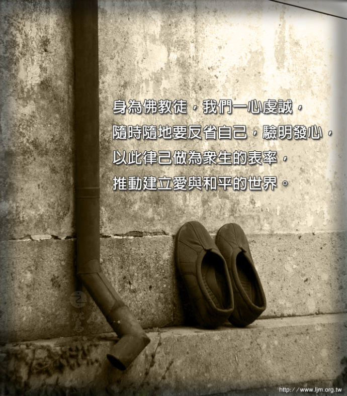 身为佛教徒,我们一心虔诚,随时随地要反省自己,验明发心,以此律己做为众生的表率,推动建立爱与和平的世界。唯有「心和平,世界就和平」,心安定不乱,以正面积极的态度汇聚涓滴爱心,化为阵阵暖流抚慰人心。