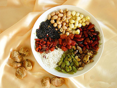 2)红枣、桂圆肉、银耳(泡开改小块)、栗子(生的,剩下的糖炒的也行,去壳)、核桃仁、枸杞、葡萄干、白果(或叫银杏)、莲子、山楂、金桔、梅肉(无核的话梅肉、杏脯以及各类果脯等)、花生仁、芝麻、芸豆(洗净、泡过的)、芋头(洗净去皮切小块)、冰糖等放下锅中。